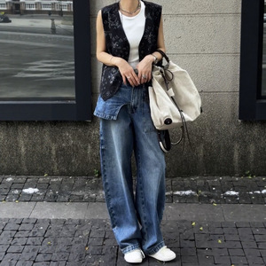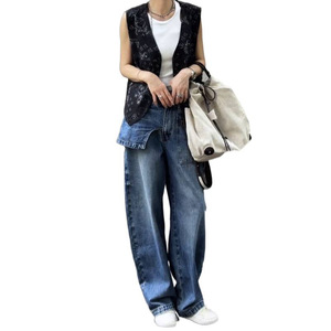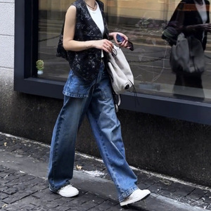 2025秋季新款屁帘复古阔腿牛仔裤女大码胖mm高腰显瘦假两件直筒裤