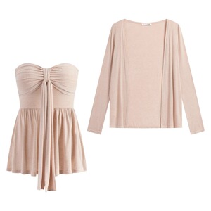 秋季绝美巨好看的小裙子粉色开衫抹胸裙套装韩系氛围感纯欲两件套