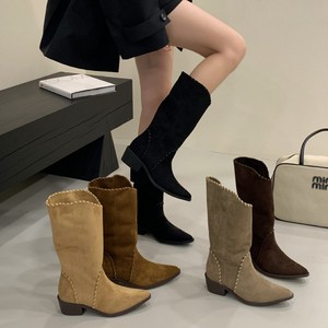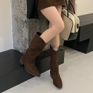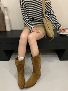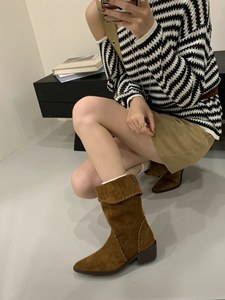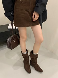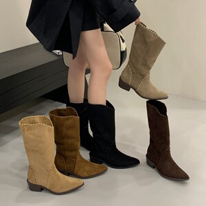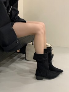 2025秋冬新款复古尖头翻边西部靴牛仔中筒女靴坡跟套筒两穿短靴