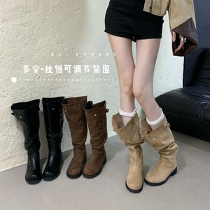 韩版圆头堆堆靴女长筒靴2025粗跟绒面可调节大筒围褶皱复古骑士靴
