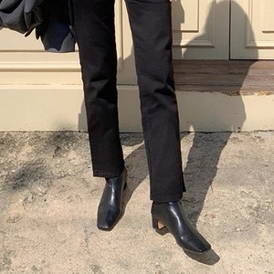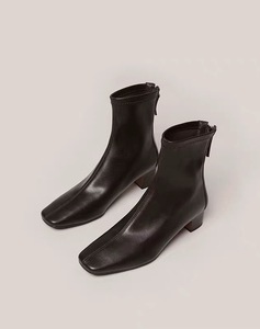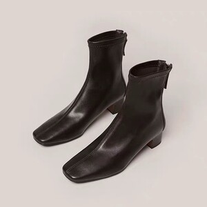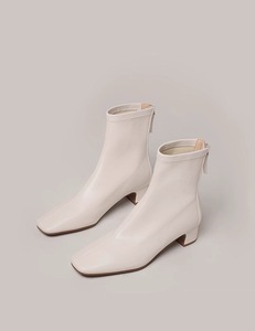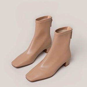 真皮中跟瘦瘦短靴粗跟方头白色弹力靴子女靴百搭单靴法式复古皮靴