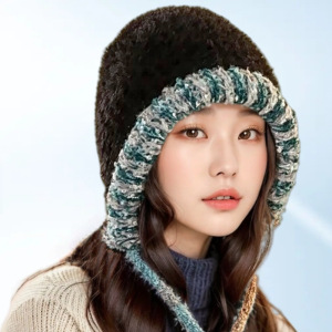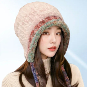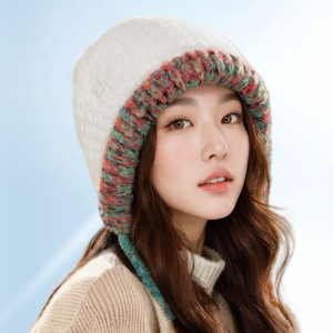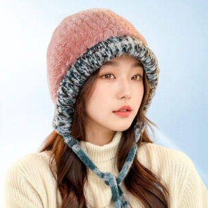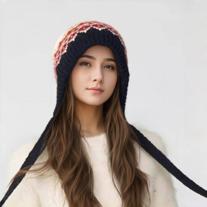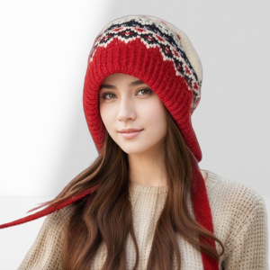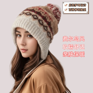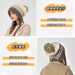 冬季费尔岛风网红毛线帽大头围系带防风护耳帽加厚保暖提花针织帽