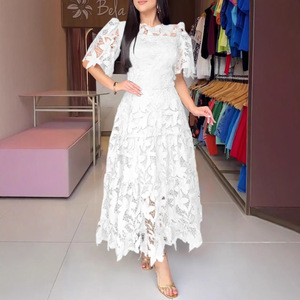 夏季新款亚马逊独立站欧美跨境女装气质圆领镂空蕾丝连衣裙女装
