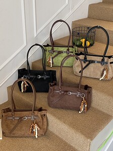高级感麂皮绒手提保龄球包包女2025新款潮复古小众腋下包大容量包
