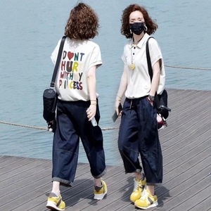 两件套装女2025年夏季新款领后背印花短袖上衣薄款牛仔八分裤
