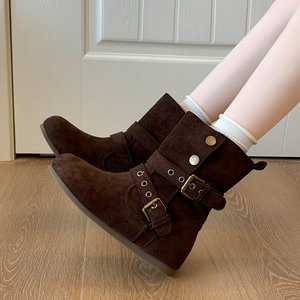 马丁靴女款2025新款秋季复古磨砂皮带扣短靴配裙子软底两穿西部靴