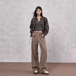 美拉德棕色灯芯绒阔腿裤女2025秋季复古高腰直筒牛油果绿休闲裤子