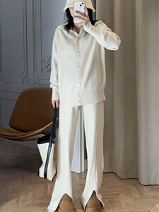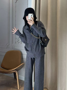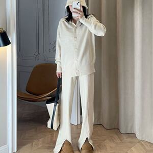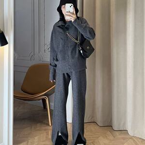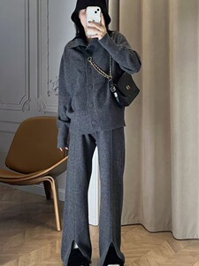慵懒风休闲羊绒棉套装女秋冬轻奢韩版宽松上衣开叉阔腿裤两件套装