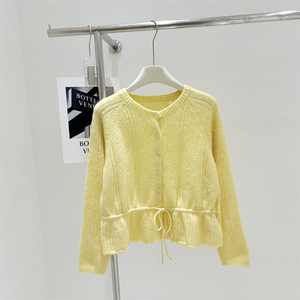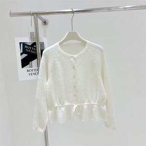 韩国订单秋装新款圆领马海毛羊毛单排扣镂空系带针织衫开衫外套女