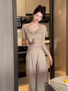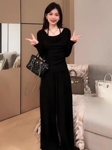 早秋时尚穿搭一整套女纯欲风假两件上衣阔腿裤两件套又a又飒套装