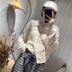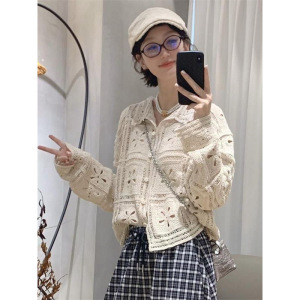 温柔风镂空钩花翻领长袖针织外套女2025春秋新款百搭时尚开衫上衣