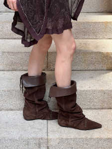 羊皮~复古尖头褶皱堆堆靴女两穿辣妹西部牛仔靴内增高显瘦长筒靴