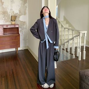 衬衫拼接假外套+阔腿裤两件套女2025春秋季时尚长裤撞色西装套装