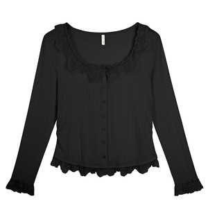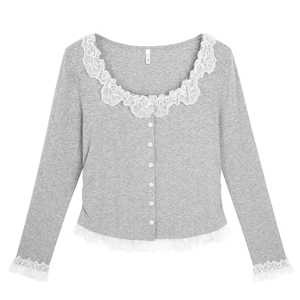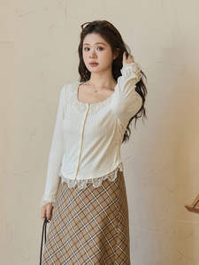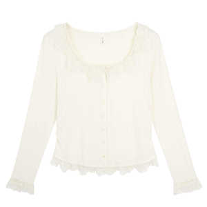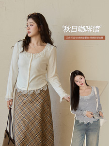 韩系温柔风方领蕾丝花边长袖大码女装胖mm大码收腰显瘦上衣65468
