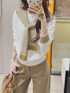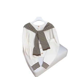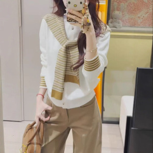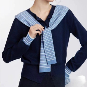 撞色条纹披肩假两件连帽毛衣开衫女2025早秋韩系学院风叠穿上衣