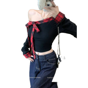 美式格子系带长袖针织衫女早秋斜肩内搭打底衫设计感紧身露肩上衣