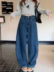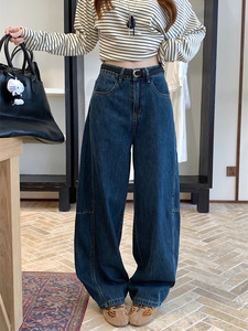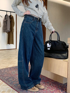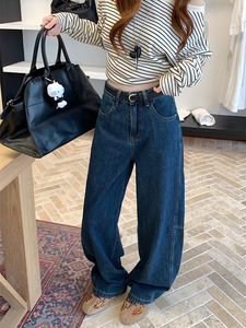 复古蓝色弯刀牛仔裤女新款阔腿高腰宽松显瘦百搭长裤