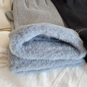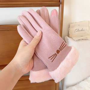 韩版时尚刺绣猫咪德绒手套女冬季防寒骑车防风加厚加绒可触屏五指
