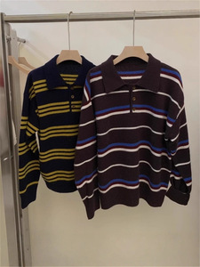 韩系条纹撞色POLO领学院风针织套头衫秋冬新款时尚百搭减龄毛衣女
