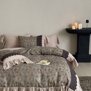 法式复古花卉全棉双层皱皱纱荷叶花边四件套柔软亲肤少女心床品