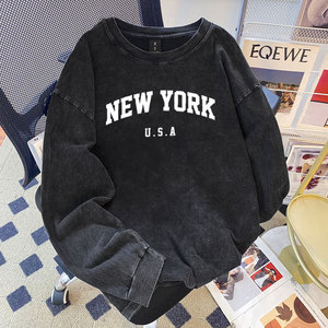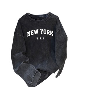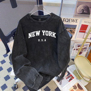 水洗黑宽松百搭气质纯棉长袖做旧显瘦洋气欧美印花复古时尚T恤女