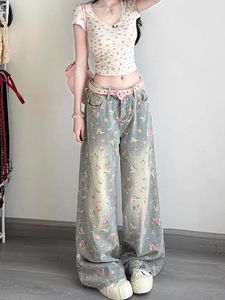 美式复古水洗花卉满印牛仔裤女夏季设计感高腰宽松显瘦直筒阔腿裤