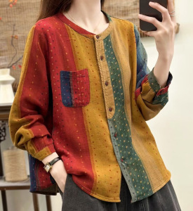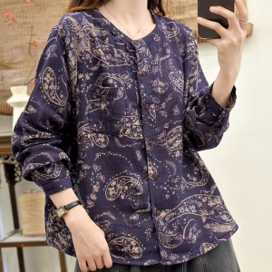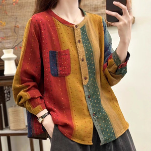 文艺复古长袖棉衬衫女春秋季新款宽松休闲圆领开衫上衣女装外套
