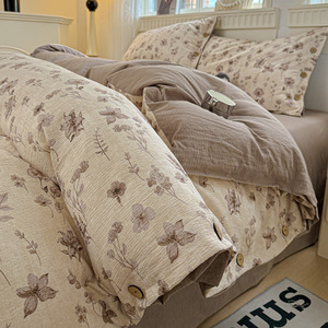 纯棉原麻四件套复古碎花纽扣款全棉床单笠被罩三件套a类床上用品