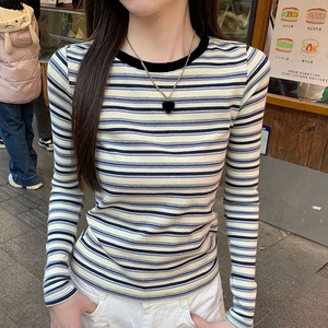 撞色圆领条纹长袖t恤女美式复古2025秋季正肩修身打底衫长袖上衣