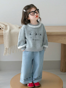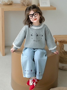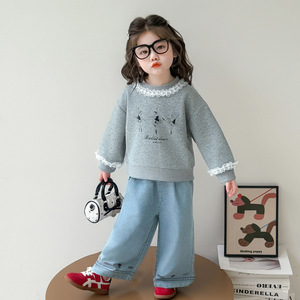 2025新款女童秋装套装洋气蕾丝花边卫衣刺绣牛仔裤两件套网红潮