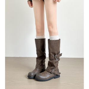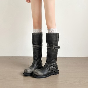 月屿复古炸街擦色堆堆靴粗跟做旧圆头皮带扣废土风长筒靴骑士靴女