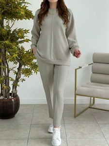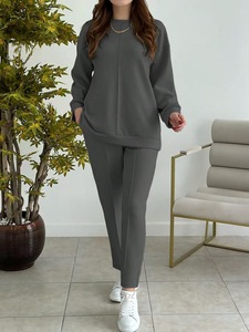 欧美跨境2025春秋时尚休闲纯色简约圆领长袖上衣休闲长裤两件套女
