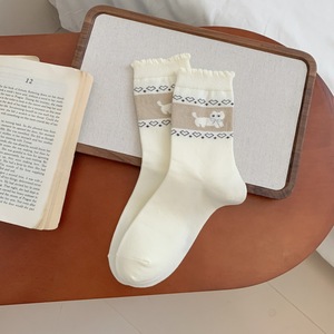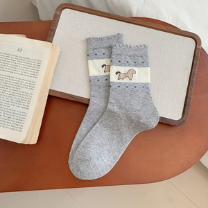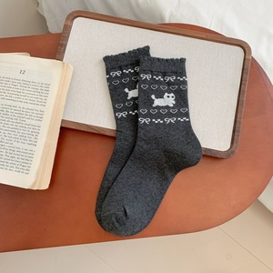 费尔岛小狗卡通中筒袜子女秋冬ins日系简约纯棉百搭灰蓝拼色长袜