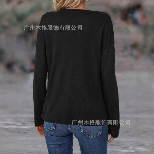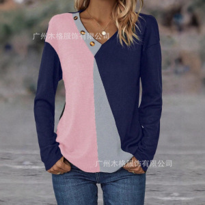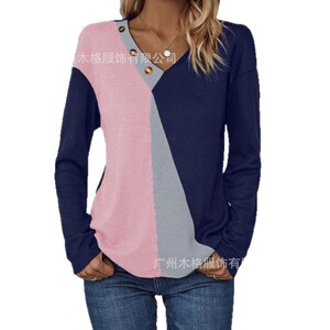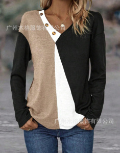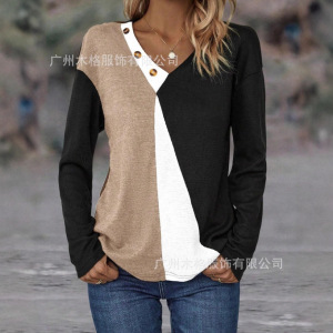 2025欧美跨境女士T恤纯色时尚现代休闲女装撞色印花宽松圆领纽扣