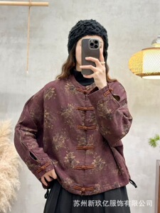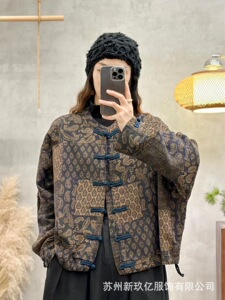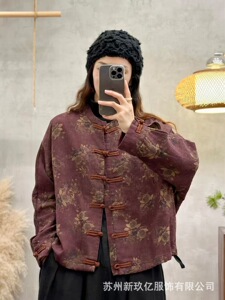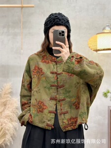 复古夹克外套女2025秋季新款文艺印花复古做旧开衫休闲盘扣上衣