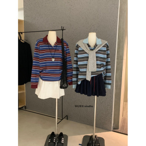 塞纳WGWE6796韩国小众美式撞色条纹polo领字母刺绣翻领长袖T恤女