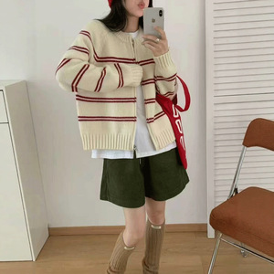 秋季条纹韩系早秋穿搭灰色针织毛衣开衫外套女2025新款高级感上衣