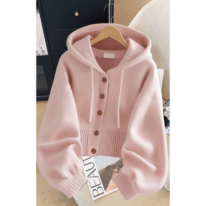 粉色软糯连帽毛衣外套女士春秋季韩系慵懒风小众宽松温柔针织开衫