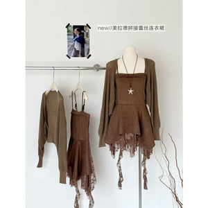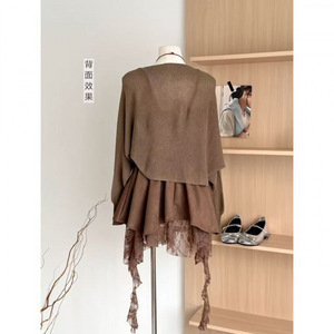 2025秋季新款美拉德外套披肩+蕾丝拼接纯欲不规则连衣裙两件套女