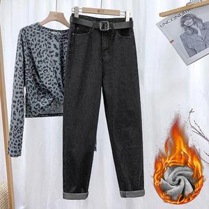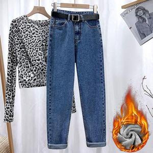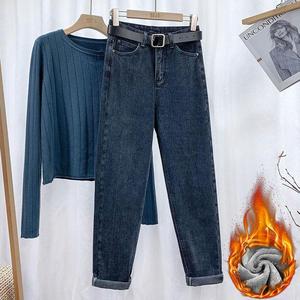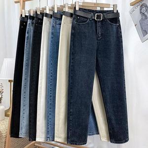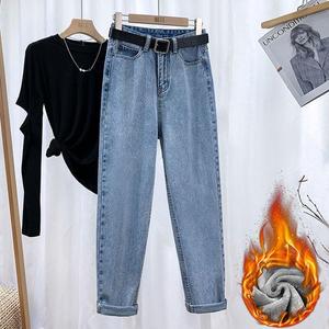 复古高街牛仔裤女秋冬新款宽松显瘦直筒阔腿高腰加绒老爹萝卜裤子