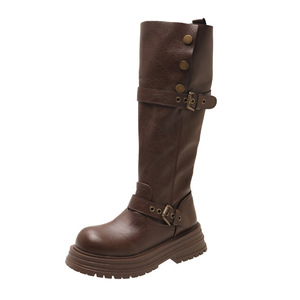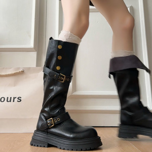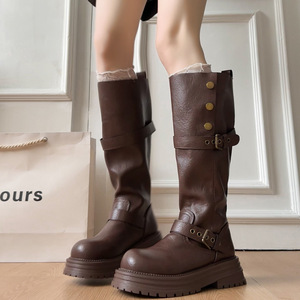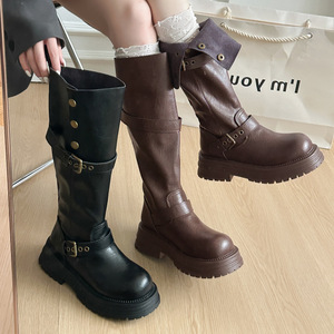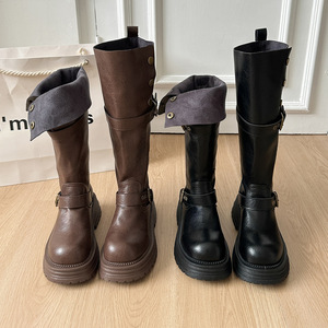 长筒靴女粗腿大筒围厚底高筒靴显瘦靴子骑士靴两穿秋复古大码女靴