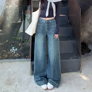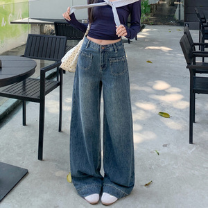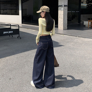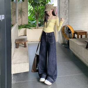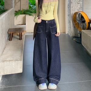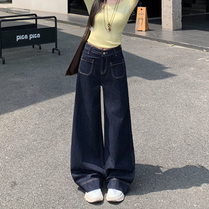 水洗深蓝色牛仔裤垂感直筒阔腿裤女秋季高腰宽松拖地裤百搭长裤子