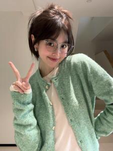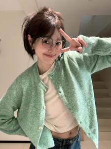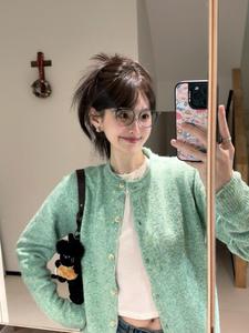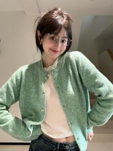 法式气质薄荷绿卷边针织开衫毛衣外套女春秋软糯绿色上衣早春外搭