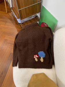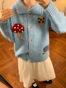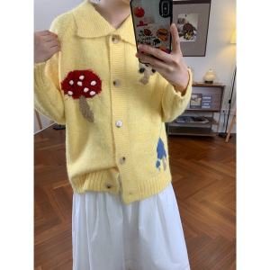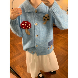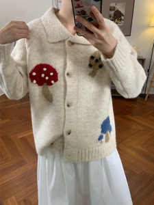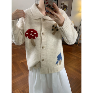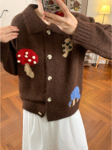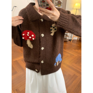 复古翻领重工蘑菇刺绣针织衫开衫2025秋冬新款宽松毛衣女外套厚