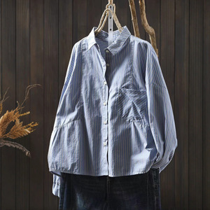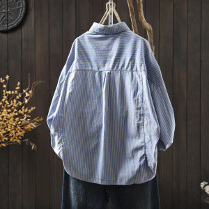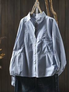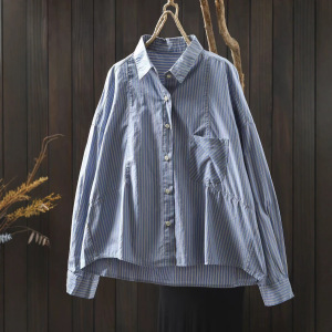 秋季新款 条纹衬衫女长袖宽松休闲棉前短后长小个子短款上衣1131