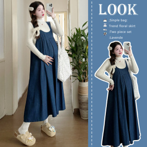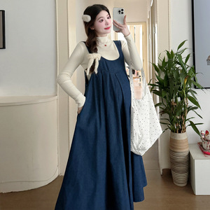 孕妇秋季连衣裙套装潮妈新款韩系时尚针织内搭宽松显瘦牛仔背带裙