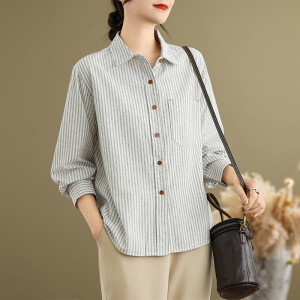 实拍2025条纹衬衫女翻领休闲百搭宽松显瘦秋季新款韩版长袖衬衣