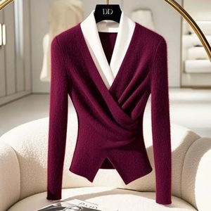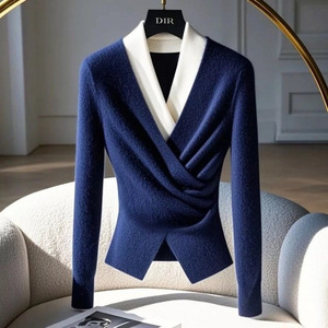设计感小众蓝色假两件针织衫女秋冬新款感超好看V领打底毛衣