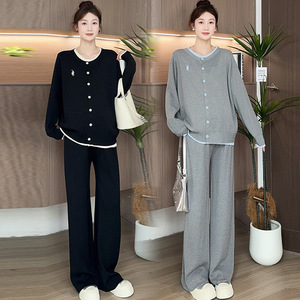 秋季哺乳衣外出辣妈款2025新款假两件针织喂奶上衣裤子两件套秋冬