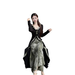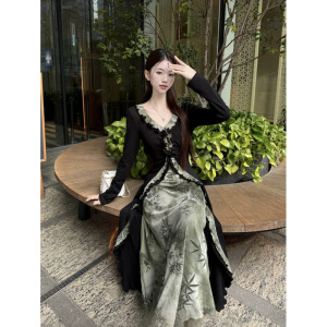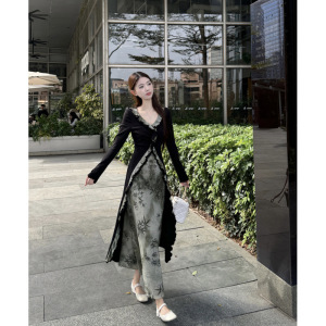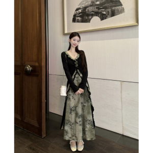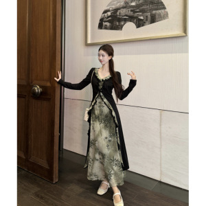 肥柒柒大码新中式国风假两件连衣裙清冷气质拼接设计感晕染长裙
